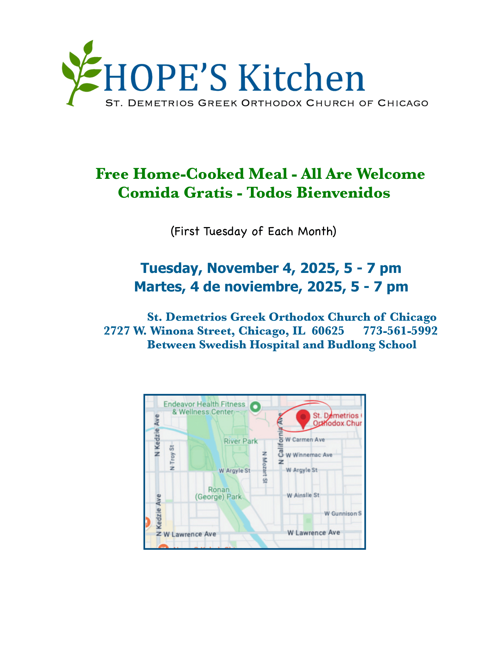 5:00–7:00 p.m. HOPE’s Kitchen Outreach